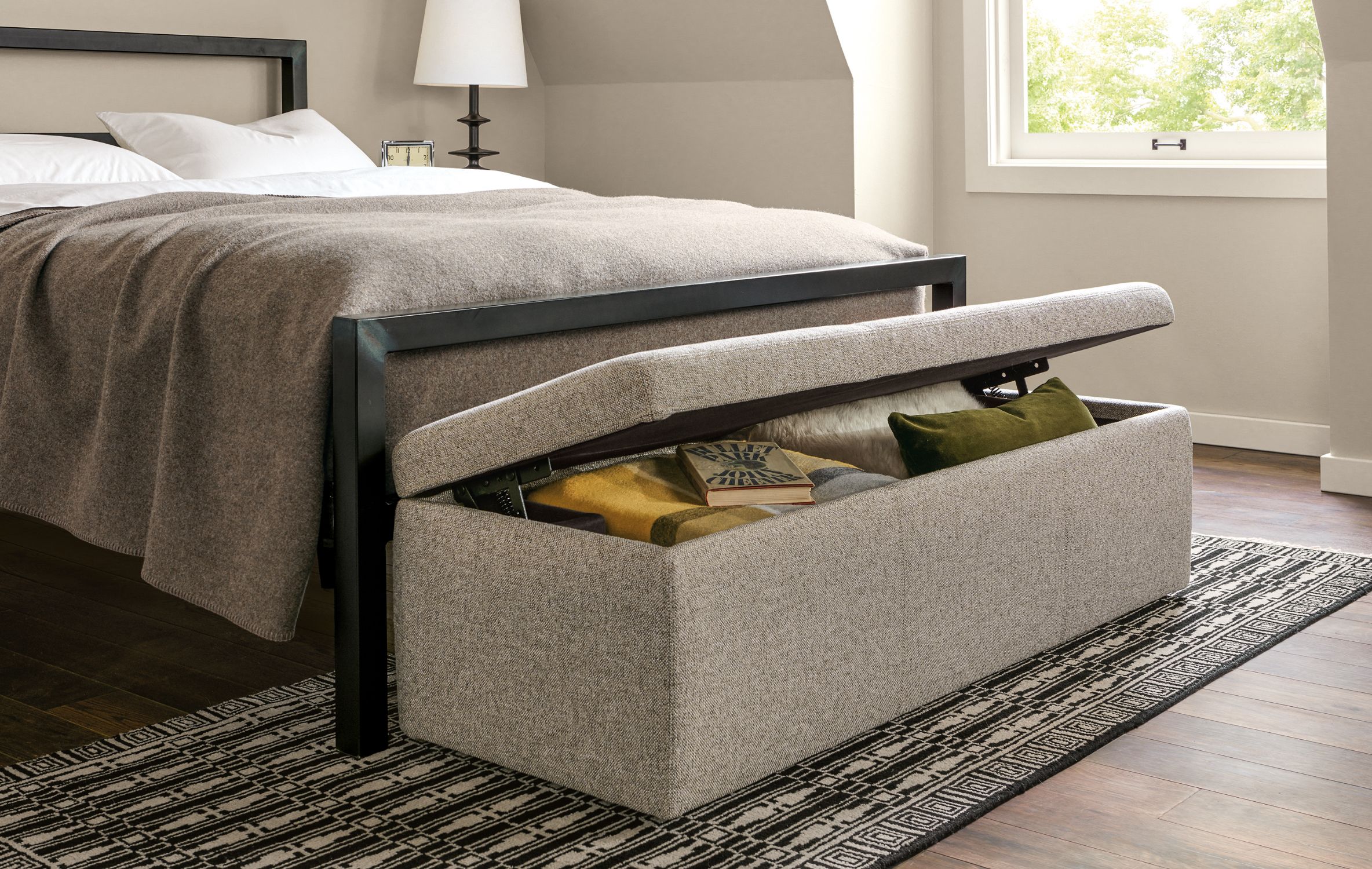- Add a storage bench at the end of a bed to stash clothes or shoes nearby.